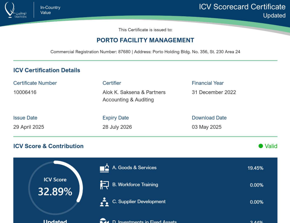 Additionally, our company is accredited by local authorities, including the In-Country Value (ICV) certification, the Supplier and Service Provider Classification Certificate from the Government Procurement Authority, and a recognized Qualification Certificate. These achievements affirm our capability, reliability, and contribution to national economic development goals.